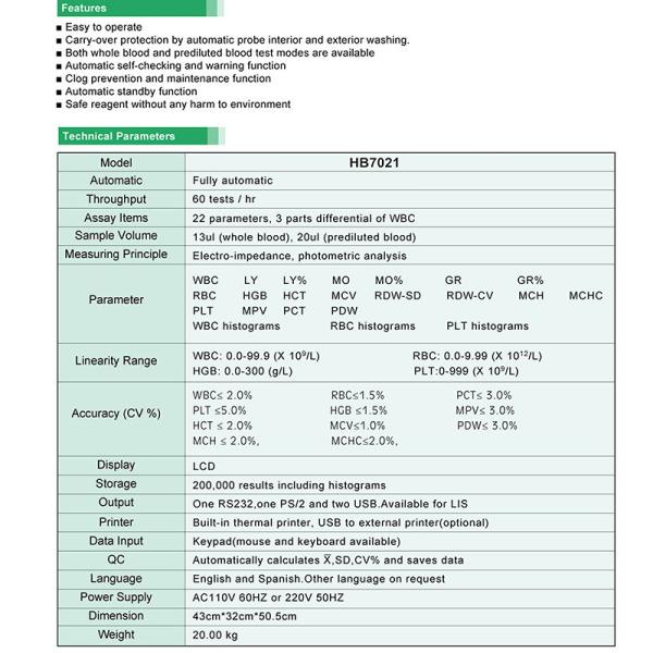| Assay Items | 22 parameters, 3 parts differential of WBC | |